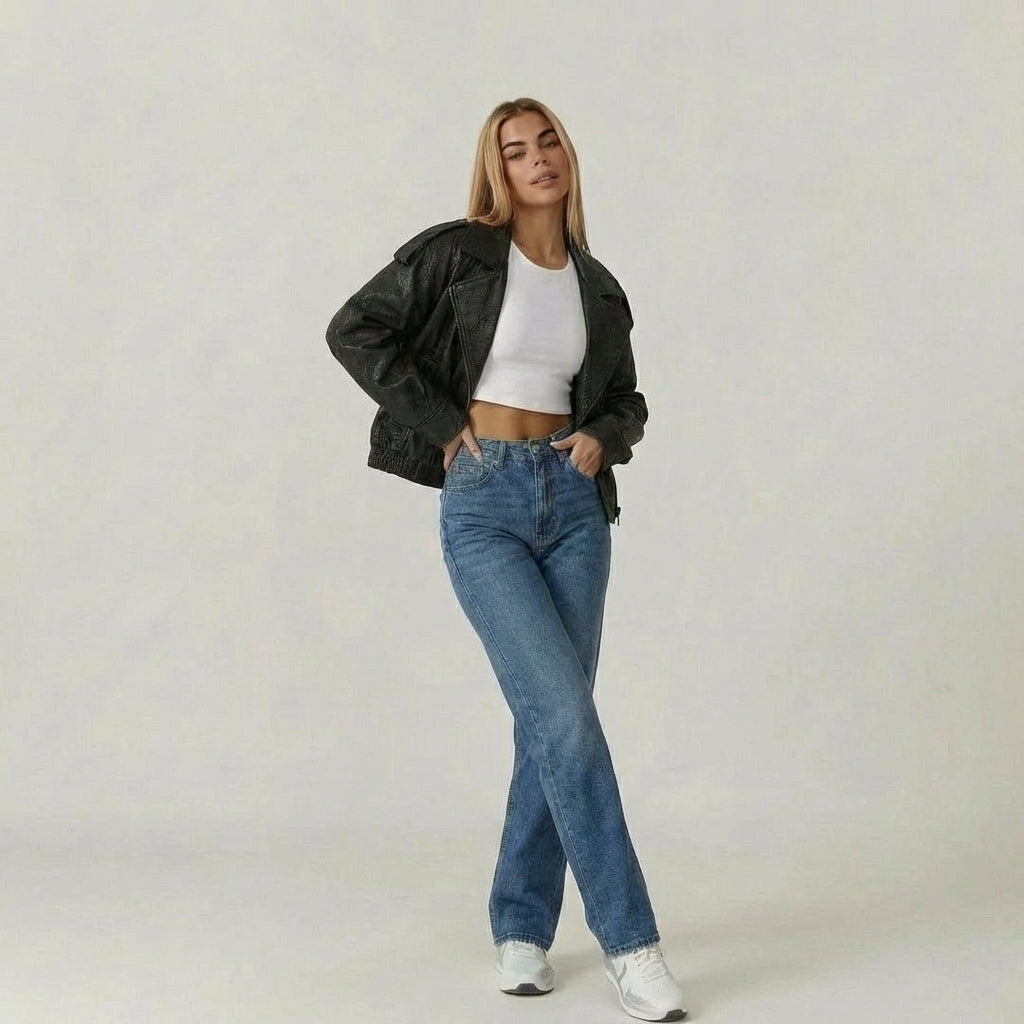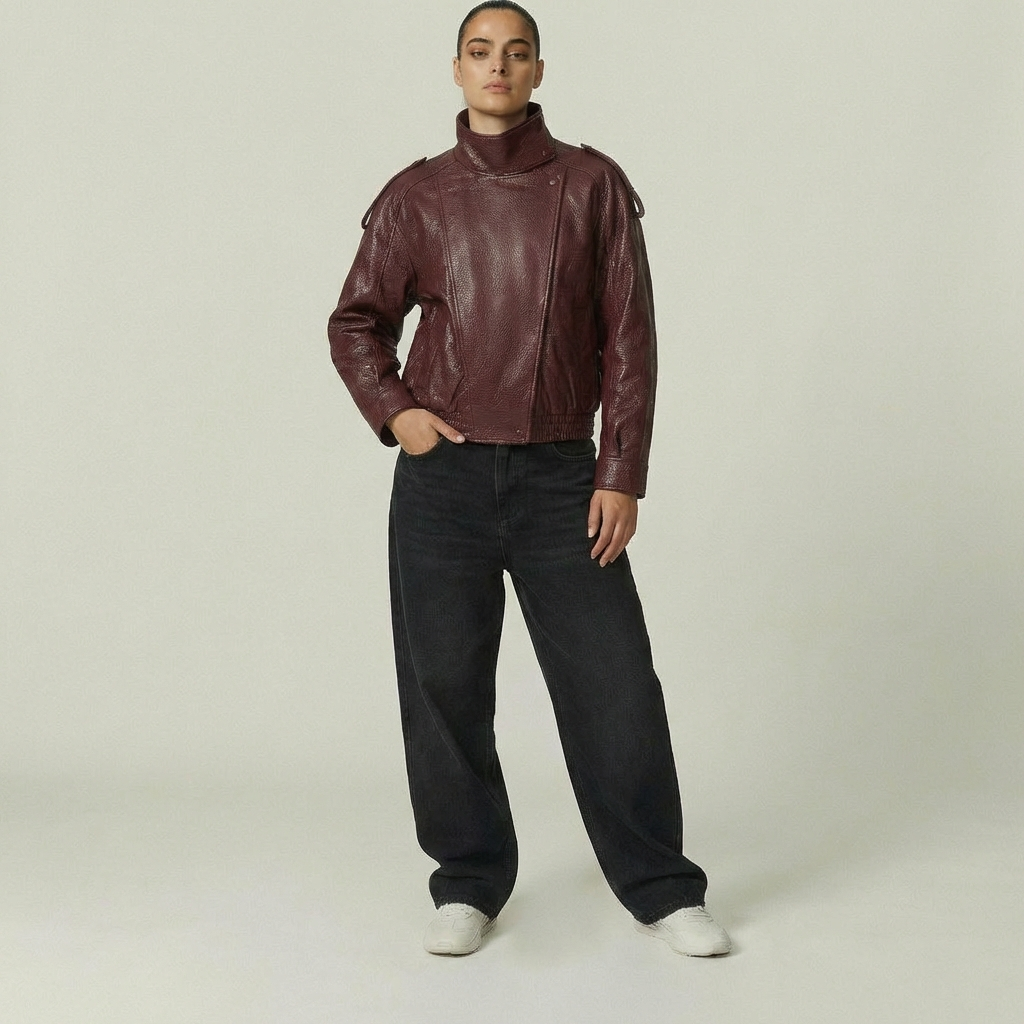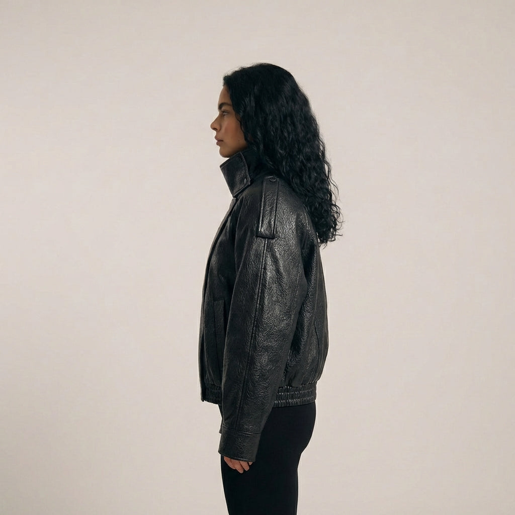 Bikerjakken i læderlook er designet til at følge dig i hverdagen med både karakter og komfort. Den oversize silhuet, den høje krave og den let strukturerede finish giver et markant udtryk uden at føles stiv, mens det bløde materiale og den elastiske kant forneden skaber balance i designet til et praktisk, urbant og alsidigt brug.