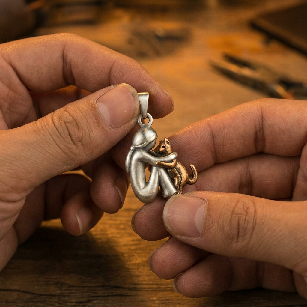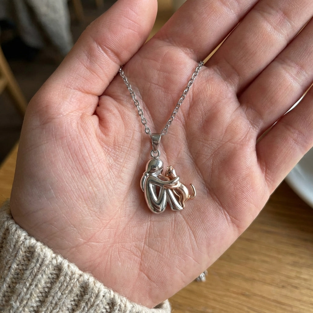 Este hermoso collar es un delicado recordatorio del amor eterno. El diseño representa a una mujer y a su gato en un abrazo tierno y cariñoso: sencillo, conmovedor y lleno de significado. Es fácil de llevar y brinda una serena sensación de confort, como llevar un cálido recuerdo cerca del corazón.