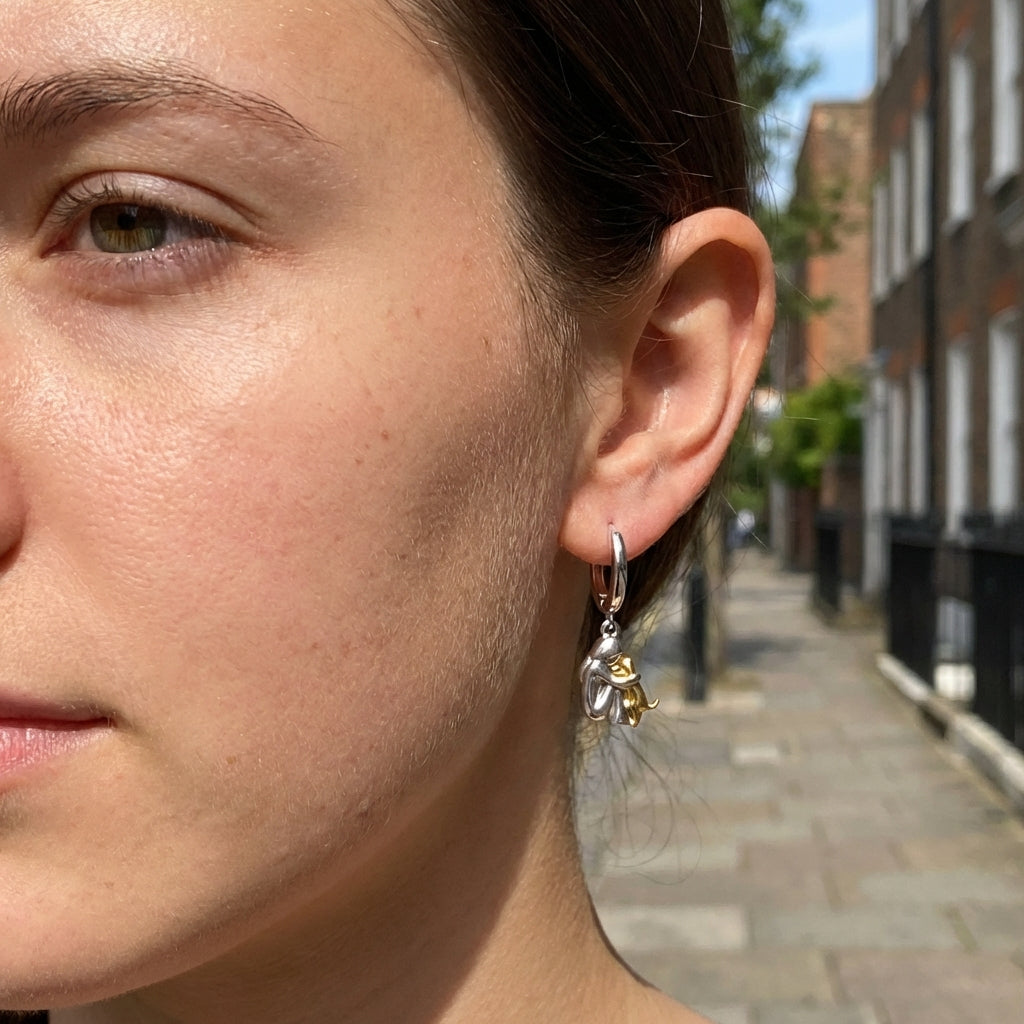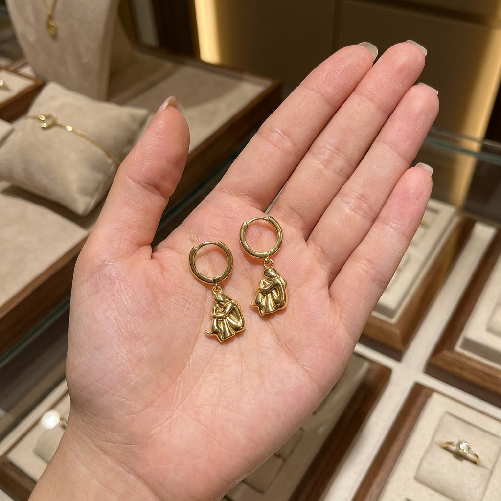 Estos elegantes pendientes capturan un amor que nunca se desvanece. El diseño representa a una mujer y a su perro en un cálido y tierno abrazo, símbolo de cariño, confianza y amistad. Ligeros en las orejas y de color suave, aportan belleza serena y significado a cualquier momento del día.